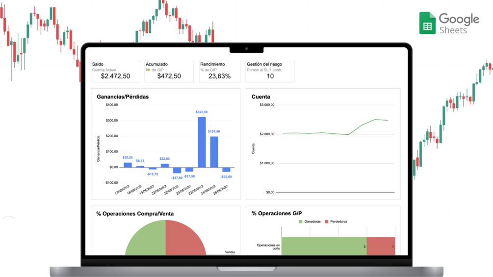 Plantilla Gratis para registrar tu diario de trading, tu operativa y el análisis gráfico del crecimiento de tu cuenta.