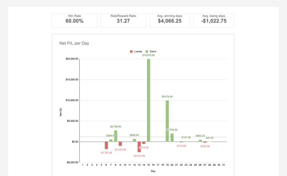 - Check your Calendar view. Have a clear picture of the full month results, spot trends, best and worst days, winning and losing streaks and make adjustments on your trading performance.